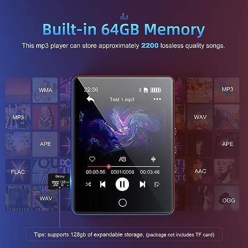 Lettore MP3, 64GB Mp3 Lettore Musicale con Bluetooth, 2,8" Schermo Tattile MP3 Digitale con Altoparlante HD Incorporato, Lettori MP3 e MP4 portatili con Radio FM, E-book, Auricolari Inclusi (Nero)