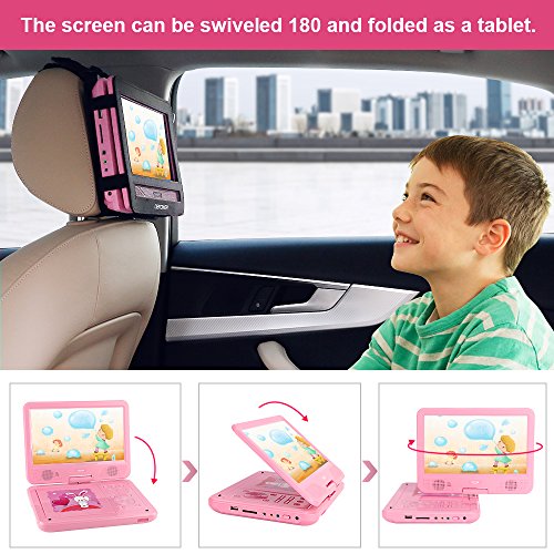 SCHERMO GIREVOLE E APPLICAZIONI MOLTEPLICI: Lo schermo girevole 10.5" pollici può essere ruotato fino a 270° e inclinato di 180°. Lo schermo può essere ruotato e inclinato in "modo tablet" e il lettore si può fissare su uno dei poggiatesta dell'auto quando si è in viaggio. La riproduzione diretta è assicurata tramite un'unità flash USB, CD, DVD, CD-R / RW, DVD -R/+R, DVD +RW/-RW, VCD, SVCD e SD card e di conseguenza si può utilizzare in auto.