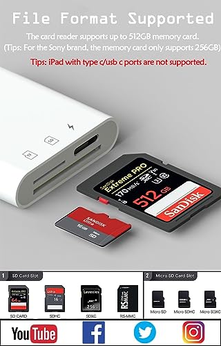 File Double Duty-Raw: l'adattatore per scheda SD per iPhone è compatibile con schede di memoria SD, SDHC, SDXC, MicroSD, MicroSDXC e MicroSDHC. Il lettore di schede SD supporta formati fotografici standard, inclusi JPEG, RAW e formati video 4K, inclusi H.264 e MPEG-4.