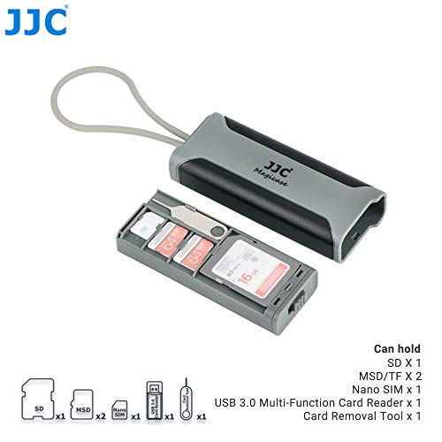 Questo non è solo un lettore di schede, ma include una custodia portatile deluxe per contenere schede di memoria: può contenere 1 x SD, 2 x mciroSD/TF, 1 x Nano SIM card e 1 x JJC USB 3.0 multifunzione e 1 x strumento di rimozione delle schede. (Nota: le schede di memoria non sono incluse)
