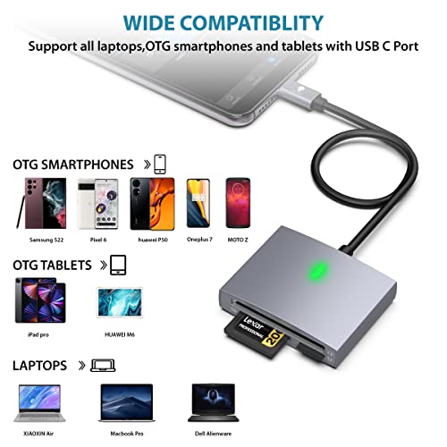 Lettura simultanea di 3 schede: migliorando la struttura hardware interna, fornisce un trasferimento dati più affidabile su 3 schede di memoria (SD, TF, CF) simultaneamente con velocità di trasferimento SD3.0 UHS-I fino a 104 MB / s per video 4K più rapidi e fotoritocco rispetto a prima.