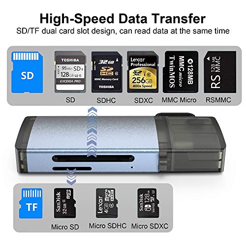 Lettore di schede SD/TF: design a doppio slot per schede SD/TF, può leggere e scrivere contemporaneamente, supporta due schede per trasferire dati, addio a ripetuti collegamenti e scollegamenti. Lettore di schede SD supporta SDHC/SDXC/SD/Micro SD/Micro SDHC/Micro SDXC e altre schede di memoria.