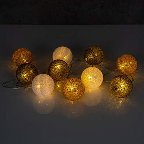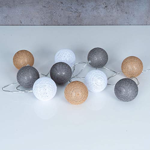 Levandeo - 10 luci a LED a forma di palline, in cotone, colore marrone, grigio e bianco, ghirlanda di lampadine