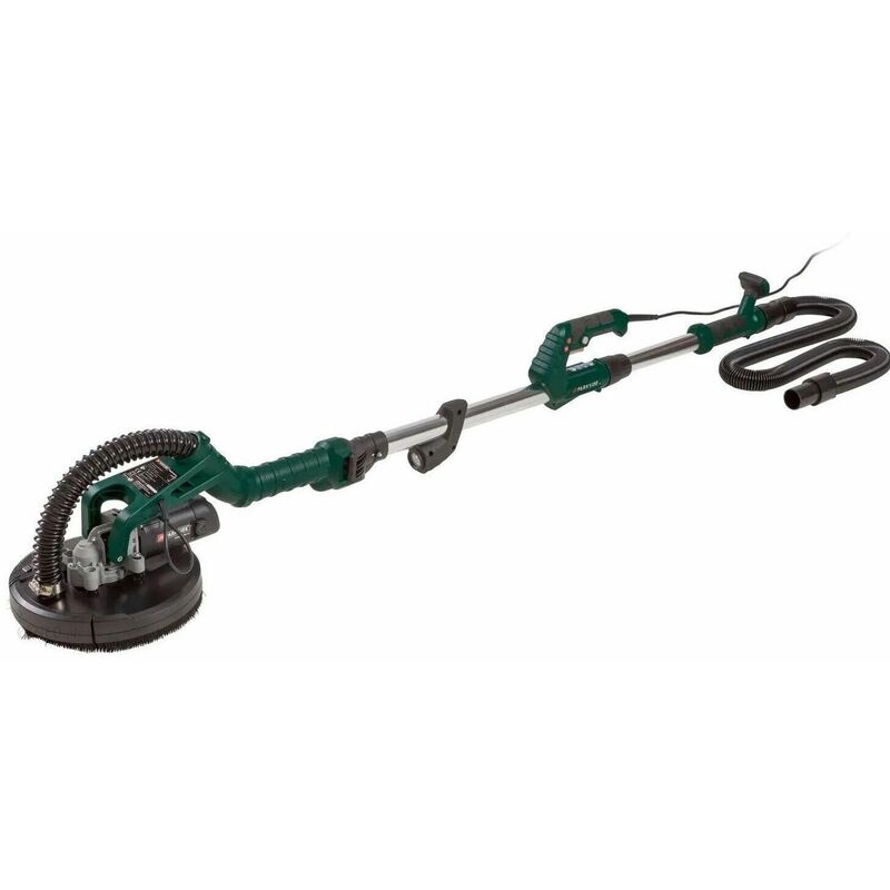 SMERIGLIATRICE PER PARETI E SOFFITTI PARKSIDE Caratteristiche · Potente motore da 710 watt con velocità regolabile per risultati di macinazione ottimali · La lunghezza totale può essere estesa da 143 cm a 170 cm con asta telescopica in alluminio · Collegamento per l'aspirazione esterna della polvere - incluso tubo estensibile · Testa abrasiva con snodo cardanico per un ottimale appoggio a parete · Platorello in velcro da 225 mm · Faro da lavoro a LED commutabile · Con anello a spazzola stabile per una guida precisa · Maniglie ergonomiche e antiscivolo · Con maniglia a T di supporto per la lavorazione del soffitto · Interruttori antipolvere · Testa del dispositivo pieghevole per risparmiare spazio Accessori inclusi: 1 tubo flessibile (circa 4 m) con adattatore per aspirazione esterna della polvere, 1 set di utensili di montaggio con 2 spazzole di carbone di ricambio, 6 dischi abrasivi (Ø 225 mm - grana 80 / 100 / 120 / 150 / 180 / 240) Specifiche tecniche · Carico