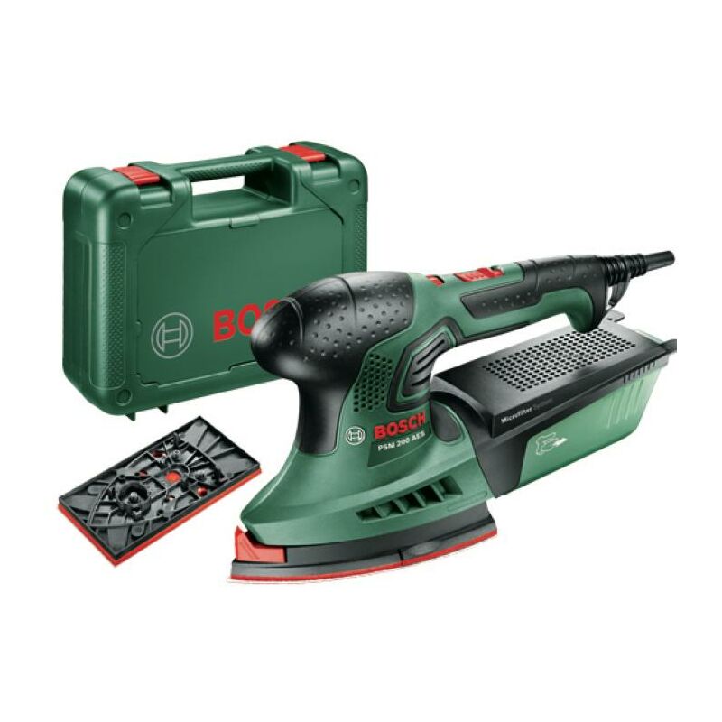 Potenza 200 Watt, piastra di levigatura 92x182 mm., nooscillazioni 26.000 giri/min., oscillazioni 1,8 mm., fissaggio foglio a microvelcro, rivestimento Softgrip, sistema SDS Plus, aspirazione polvere integrata con sistema Microfilter. Dotazione: piastra rettangolare, foglio abrasivo a delta, foglio abrasivo rettangolare, valigetta