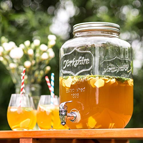 Dispenser in vetro da 8 l, con coperchio a vite e rubinetto in plastica.