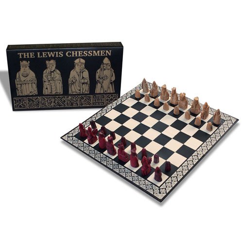 Questo piccolo set di scacchi Lewis presenta scacchi in miniatura in resina intagliata, ed è basato su uno dei tesori più famosi del British Museum