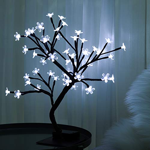 Lewondr Lampada da Tavolo Albero bonsai, Bonsai in Fiore di Ciliegio in Ferro con 48 Luci Led, Lampada da Comodino Luci a Batteria Albero Decorazione Camera Tavolo Scrivania Soggiorno - Luce Bianco