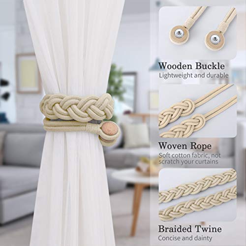 Lewondr 2 Pezzi Fermatende Calamita, Fermatenda Magnetico, Raccogli Tenda Fermatende in Cotone Intrecciato con Fibbia in Legno, Fibbia Decorativa per Tende per Casa Soggiorno Ufficio Cafe, Beige