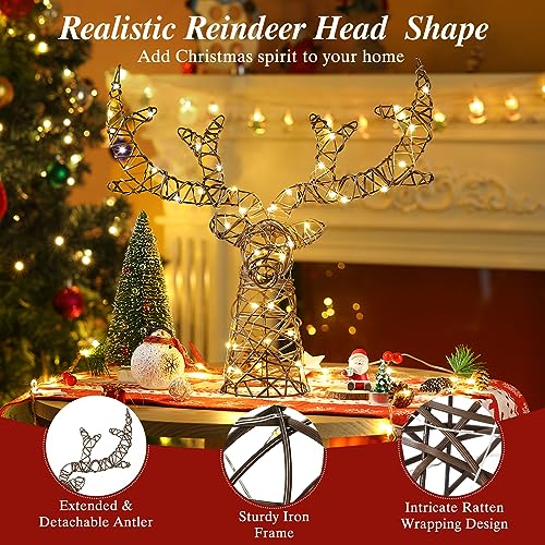 Lewondr Puntale per Albero di Natale, Punta per Albero a Forma di Cervo con Cornice in Metallo con 50 Perline di Luce Calda, Decorazione per Albero con Timer Telecomandato e Alimentato da USB, Marrone