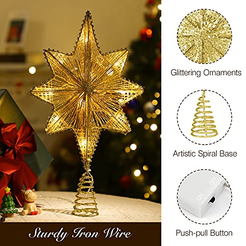 Lewondr Punte di Albero di Natala a Forma di Stella Polare in Metallo, Super Grande Puntale dell'Albero di Natale Glitterato con Luci Integrate Fredde, Decorazioni Natalizie, 42 cm, Oro