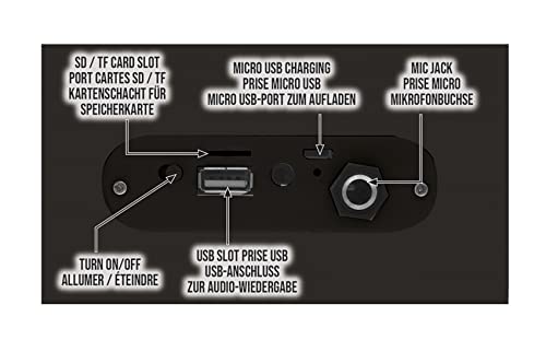 Con porta USB, porta micro SD / TF fino a 32 GB e porta aux-in per la trasmissione di musica, podcast e MP3 da qualsiasi sorgente audio! Jack ausiliario da 3,5 mm per collegare qualsiasi dispositivo audio esterno