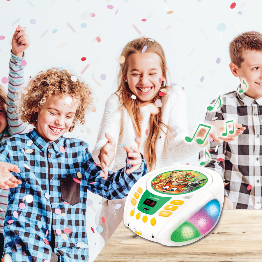 Dettagli del prodotto: Età: da 3 anni in su Fresco lettore CD portatile con Bluetooth, per la connessione senza fili a Smartphone s, tablet e altri dispositivi Bluetooth Il lettore CD con il grande motivo della famiglia di animali e i nuovi effetti luminosi multicolore è perfetto per i bambini Il lettore può connettersi in modalità wireless tramite Bluetooth 5.0, ad esempio con Smartphone o con un tablet. Dispone inoltre di una presa per microfono aggiuntiva, alla quale è possibile collegare in un secondo momento un microfono di qualità. Adatto per CD, CD-R e CD-RW Ingresso audio aggiuntivo per Smartphone s e tablet Funzione di programmazione/ripetizione integrata Altoparlante: 3 W x 2 Alimentazione: Richiede una presa di corrente (cavo incluso) o batterie 6c / LR14 (non incluse). Dimensioni e materiali: Dimensioni da assemblato (lunghezza x larghezza x altezza): 20,5 x 23,8 x 11,6 cm. Materiale: plastica Incluso nella consegna: Spina di rete Cavo incluso nella fornitura Attenzione: le batterie e il microfono non sono inclusi nella fornitura.