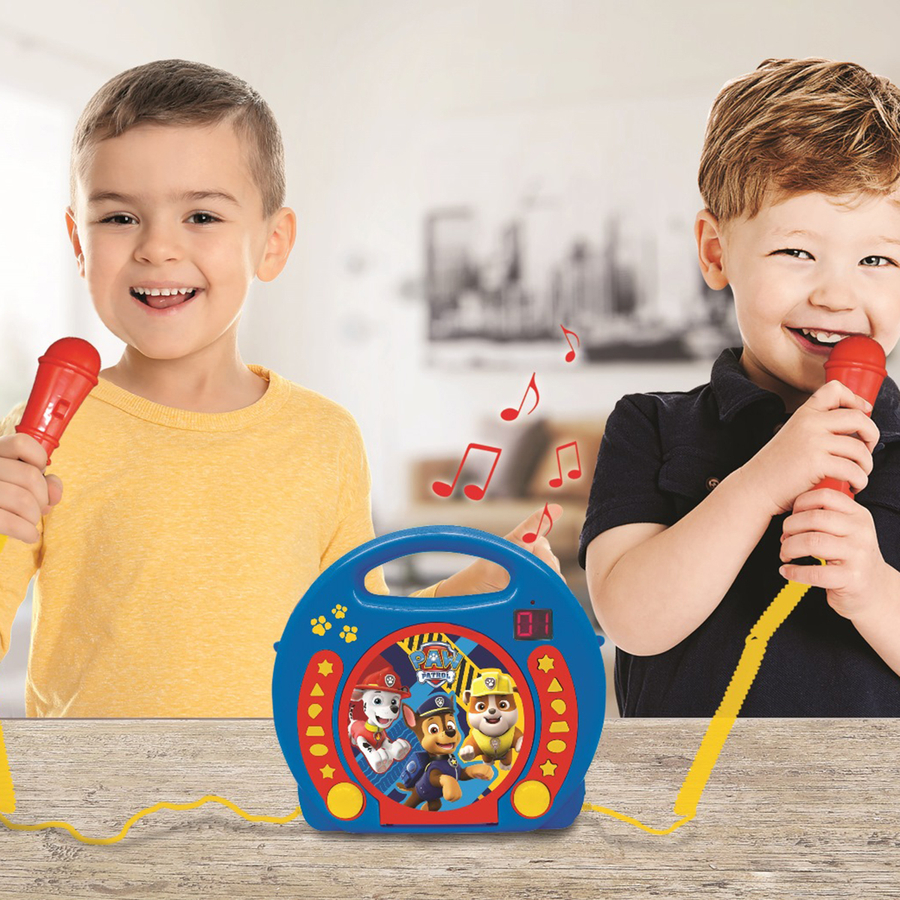 Un lettore audio per bambini con Paw Patrol Design ! Lettore CD a caricamento frontale con funzione di programmazione, tasto di ripetizione e indicatore LED del brano in riproduzione.un grande extra: 2 microfoni sono inclusi per cantare le vostre canzoni preferite da soli o con un amico! Il volume del microfono è regolabile. Le cuffie possono essere collegate tramite la presa AUX per ascoltare in silenzio le grandi storie. Robusto, leggero e confortevole, con una maniglia che permette di portare il giocatore ovunque! Dettagli del prodotto: Dimensioni (lunghezza x larghezza x altezza): 26,3 x 10 x 20,9 cm Compatibile con CD / CD-R / CD-RW Con funzione di ripetizione, programmazione su CD e display a LED Inclusi 2 microfoni Presa d'ingresso AUX Alimentazione elettrica: Adattatore AC o 4 batterie LR14 / C (non incluse) Età: Da 3 anni Attenzione Non adatto a bambini sotto i 3 anni. Batterie necessarie (funzionamento a corrente alternata o 6 x C / LR14) o alimentatore non incluso!