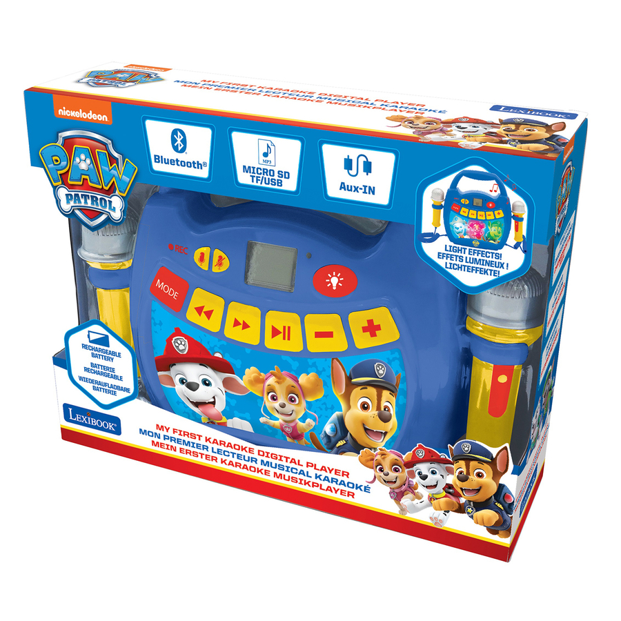 Paw Patrol - Canta insieme al tuo preferito stars ! Canta insieme ai tuoi amici usando i due microfoni incorporati e prova il tuo talento con i tre diversi effetti vocali. Collega il tuo Smartphone o tablet via Bluetooth al lettore karaoke per ascoltare la tua musica e cantare insieme! La pratica maniglia per il trasporto ti permette di portare il lettore con te ovunque tu vada. Dettagli del prodotto: Dimensioni (lunghezza x larghezza x altezza): 27,9 x 8,1 x 21,2 cm Materiale: plastica Presa Aux-in Slot Micro SD Porta USB Due microfoni integrati Tre effetti vocali: Voce alta, bassa o eco Funzione di registrazione con voce e musica Effetti di luce multicolore Jack per cuffie Maniglia per il trasporto Alimentazione: Batteria ricaricabile tramite porta di ricarica USB-C (cavo incluso). Età: da 3 anni