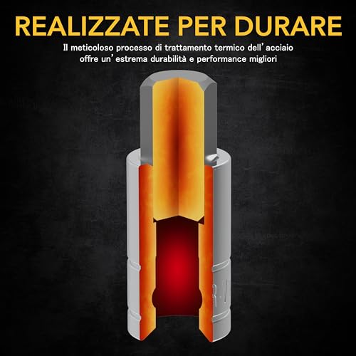 DURATURO - Punte in lega di acciaio S2 che riduce il deterioramento. Chiavi a bussola in acciaio Cromo Vanadio temprato per una maggiore forza di torsione.