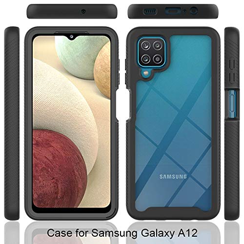 LEYAN Cover per Samsung Galaxy A12, Custodia Protezione Completa a 360 Gradi, Pannello Posteriore Trasparente, Rigida PC/TPU Gel Slim Bumper Silicone Rugged Case, Nero