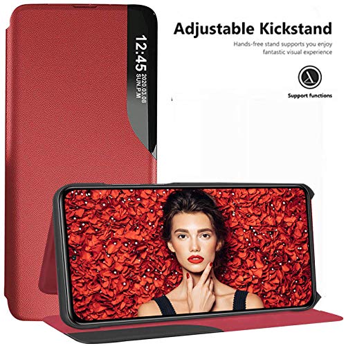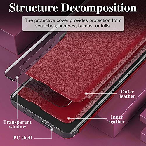 LEYAN Cover per Xiaomi Redmi Note 10 PRO (6.67"), Smart Specchio View Flip PU Leather Case, Premio Custodia Cellulare con Una Schermo Finestra, Folio Case con Supporto Pieghevole, Rosso