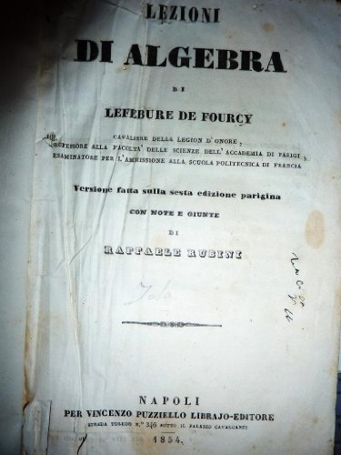 LEZIONI DI ALGEBRA DI LEFEBURE DE FOURCY, Cavaliere della Legion d'Onore. Professore alla Facoltà delle Scienze dell'Accademia di Parigi, Esaminatore per l'Ammissione alla Scuola Politecnica di Francia. Versione fatta sulla Sesta Edizione Parigina con Note e Giunte di RAFFAELE RUBINI