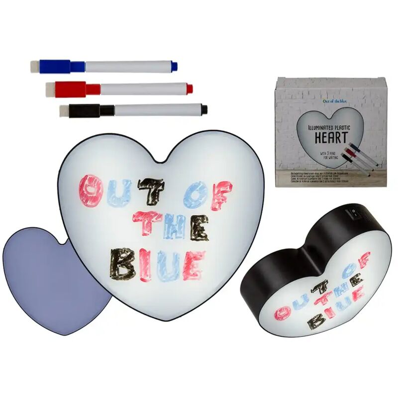 Lavagna a forma di Cuore di plastica illuminato con 3 penne per scrivere circa 15 x 15 Cm, funzionamento a batterie, occorrono infatti 3 pile AA non comprese.