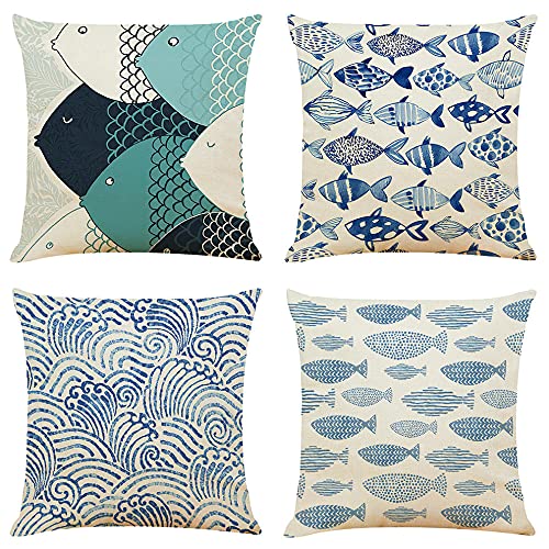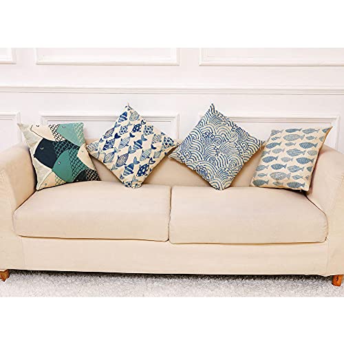 LHUTY Federe per Cuscino Pesce azzurro dipinto a mano Moderna Copricuscini Decorativi in Cotone e Lino con Cerniera Invisibile 45 x 45 cm, Set di 4 Cuscino per Soggiorno Sedia Divano