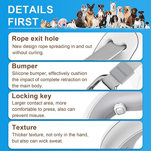 360° senza nodi:moestar retrattile per cani presenta un nuovo design del foro di ritrazione a forma di U per una ritrazione più facile e fluida durante l'uso quotidiano, mentre il gancio girevole ruota di 360 gradi per evitare nodi nel guinzaglio e consentire al cane di muoversi liberamente intorno a voi. Il guinzaglio retrattile per cani è adatto a cani di piccola e media taglia (fino a 66 libbre).