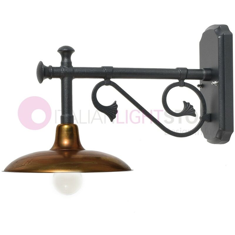 cappello in ottone anticato d.26 cm. Lanterna a parete per esterni in pressofusione di Alluminio verniciata con polvere poliestere (la verniciatura a polvere viene fatta dopo un trattamento anticorrosivo per elevare la resistenza ai raggi UV e alle nebbie saline), ideale per illuminare facciate di case, spazi aperti, porticati e verande. Dimensioni: h. 35 cm., sporgenza 46 cm.;