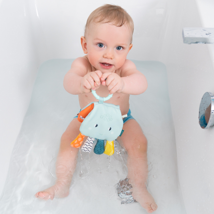 Dettagli del prodotto: Età: da 0 mesi I bambini possono dare vita a simpatici animali acquatici con questo libro di stoffa per la vasca da bagno. I motivi subacquei possono essere esplorati, ammirati e scoperti su 6 pagine Tanti nuovi amici per il bagno: il simpatico polpo, la dolce stella marina e la simpatica cozza amano stare in acqua e aden giocare e toccare. Il sonaglio nascosto, la carta frusciante e lo specchio fanno sorridere il bambino. Favorisce i primi esercizi di presa e il riconoscimento di sé del bambino Il libro da bagno permette di giocare in modo entusiasmante nella vasca da bagno, in piscina o in vacanza al mare Ideale come regalo per la nascita, il battesimo o come regalo di compleanno per neonati e bambini. Dimensioni e peso: Misure da assemblato (lunghezza x larghezza): 15 x 12 cm Peso: 0,11 kg Materiale e cura: Materiale della tomaia: tessuto stampato, spugna, tessuto a rete. Imbottitura: 100% poliestere Istruzioni per la cura: Lavare a mano