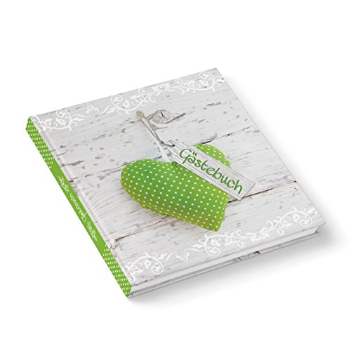 Libro degli ospiti con copertina rigida, motivo: cuore Verde su Legno Bianco, Quadrato, 21 x 21 cm, con 164 pagine vuote numerate, Battesimi o compleanni, ottima qualità