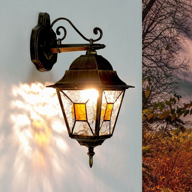 Dettagli del prodotto Materiale: Alluminio, vetro Dimensioni: larghezza: 185 mm, altezza: 470 mm, profondità: 260 mm Attacco: 1x E27 - fino a. 60 Watt Classe di protezione dagli spruzzi: IP44 Colore: Oro antico Peso: 1000 grammo Descrizione del prodotto La lampada da parete Salzburg in stile rustico è perfetta per l'uso esterno: realizzata in vetro robusto ed alluminio pressofuso con una struttura leggera ma compatta, resiste alle intemperie, fenomeni di corrosione e pioggia. La classica forma a lanterna e l'elemento in vetro colorato rievocano memorie e ricordi del passato, conferendo un accento vintage ed originale all'arredo. Illuminazione perfetta per la vostra zona d'ingresso, balcone o terrazzo. Attacco E27 con una potenza max. di 60 Watt Salzburg ha una grande versatilità: compatibile con LED e lampade a risparmio energetico. In questo modo si può personalizzare la scelta della lampadina e decidere a propria discrezione, quale efficienza energetica o quale luminosità adottare