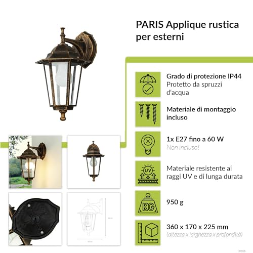 Licht-Erlebnisse Applique da parete Paris Lanterna elegante bronzo anticato vintage stile rustico E27 impermeabile IP44 ideale per esterni: cortile, balcone e giardino