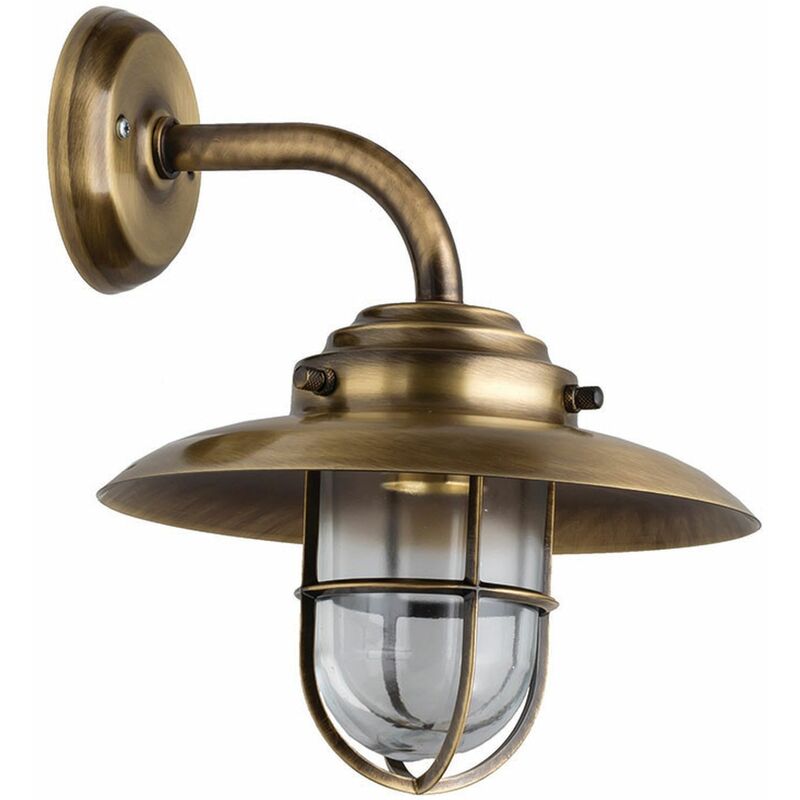 Dettagli del prodotto Materiale: Ottone, vetro Dimensioni: larghezza: 300 mm, altezza: 280 mm, profondità: 260 mm Attacco: 1x E27 fino a. 18W Classe di protezione dagli spruzzi: IP23 Colore: Ottone antico Peso: 1700 grammo Descrizione del prodotto Elegante lampada da parete per esterni in ottone massiccio e vetro;