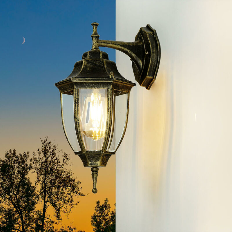 Dettagli del prodotto Materiale: Alluminio, vetro vero Dimensioni: larghezza: 195 mm, altezza: 355 mm, profondità: 165 mm Attacco: 1x E27 fino a. 60 Watt Classe di protezione dagli spruzzi: IP44 Colore: Oro antico Peso: 1000 grammo Descrizione del prodotto La lampada da esterno Lyon in oro anticato è realizzata in alluminio pressofuso e vetro, Lyon si presta anche come un'elegante decorazione al vostro giardino Attacco E27 con una potenza max. di 60 Watt La lampada da esterno dallo stile classico conferisce armonia e un tocco raffinato al vostro arredamento. Lyon illumina perfettamente il cortile, balcone o terrazzo Lyon è molto versatile ed è compatibile non solo con qualsiasi lampadina con attacco E27(anche se è consigliabile adottare E27), ma anche anche a LED e lampade a risparmio energetico. In questo modo si può personalizzare la scelta della lampadina e decidere a propria discrezione, quale efficienza energetica o quale luminosità adottare. La tonalità della lampada vintage è