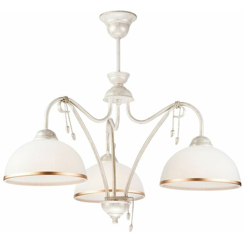 Dettagli del prodotto Materiale: Metallo, vetro Dimensioni: larghezza: 450 mm, lunghezza: 550 mm Attacco: 3x E27 fino a 60W Classe di protezione dagli spruzzi: IP20 Colore: Bianco Shabby, Bianco, Oro