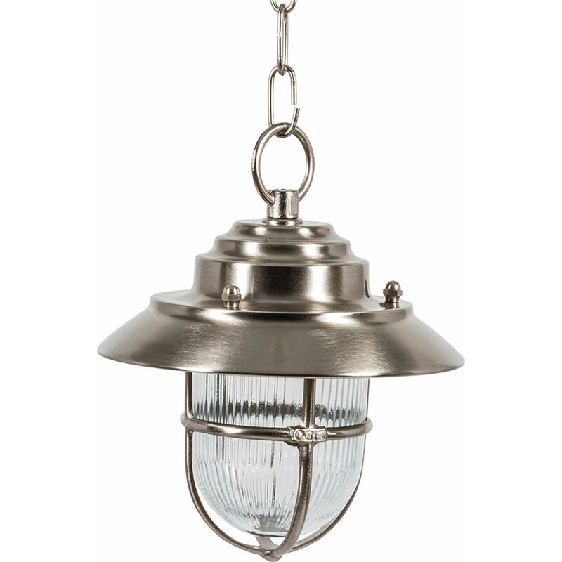 Dettagli del prodotto Materiale: Ottone, vetro Dimensioni: larghezza: 210 mm, profondità di sospensione: 740 mm, lunghezza: 210 mm, diametro: 210 mm Attacco: 1x E27 fino a. 18W Classe di protezione dagli spruzzi: IP54 Colore: Nichel opaco Peso: 2250 grammo Descrizione del prodotto Lampada da esterno massiccia in ottone in nichel opaco. La lampada a sospensione è modellata su una lampada antica da nave, e dona accenti decorativi all'ingresso, al balcone o alla terrazza, con catena accorciabile (max. 50 cm di lunghezza): perfetto per l'ingresso, il balcone o la terrazza, ombrellone: diametro 21 cm, altezza: 24 cm, in vero ottone: resistente alle intemperie;