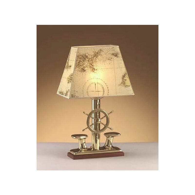 Dettagli del prodotto Materiale: Ottone, carta pergamena, legno Dimensioni: larghezza: 140 mm, altezza: 330 mm, lunghezza: 240 mm Attacco: 1x E27 fino a. 60W Classe di protezione dagli spruzzi: IP20 Colore: Ottone lucido, crema Descrizione del prodotto Lampada da tavolo marittima in vero ottone decorata con dettagli amorevoli;
