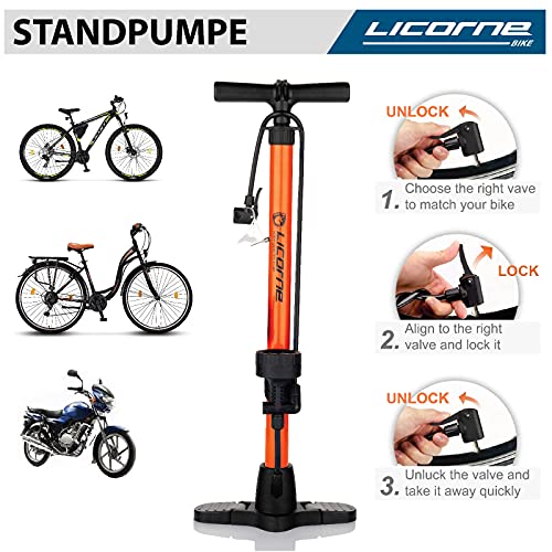 Licorne Bike Pompa Da Pavimento Da Bicicletta Con Grande Manometro Per L'Indicazione Della Pressione, Doppia Testa Adatta A Tutte Le Valvole (Dunlop, Francese, Auto) (Arancione (Piedini Pieghevoli))