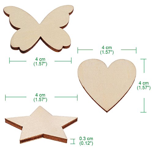 Lictin - 150 dischi in legno a forma di cuore, stella in legno, fette di legno, fette di farfalla, 50 pezzi