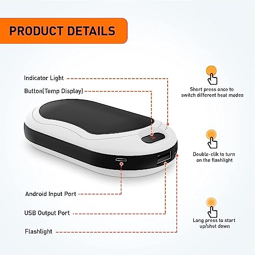 【Garanzia di sicurezza multipla】Adotta materiali ignifughi di prima classe + sistema di protezione da sovraccarico, abbiamo un rigoroso controllo di qualità per garantire la sicurezza degli scaldamani. Può fungere da torcia per fornirti luce e premere il pulsante due volte di fila per attivare o disattivare la funzione della torcia.