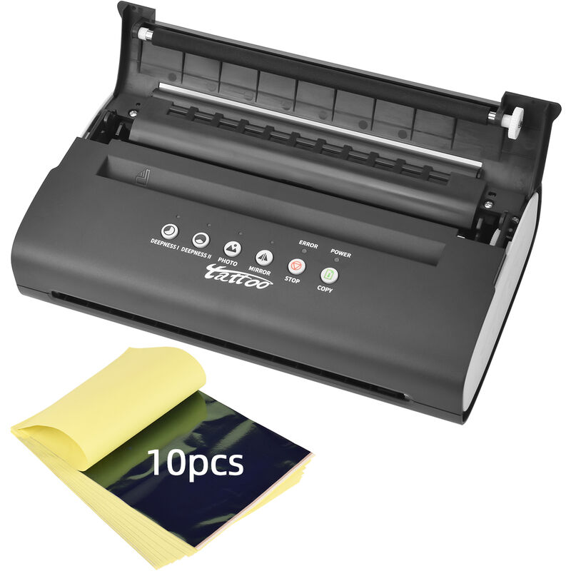Più economico: Non c'è bisogno di parti di ricambio e inchiostro, più economico di altre macchine per stencil per tatuaggi tradizionali. Il formato della carta di trasferimento compatibile è di circa 8,5"*11" (W*L). Sono inclusi 10 pezzi di carta transfer per tatuaggi. Impostazioni multiple: puoi scegliere tra le impostazioni Specchio, Foto e 2 Profondità (I e II) per soddisfare le diverse esigenze di copia dello stencil . (Le profondità I e II sono per linee sottili e linee pesanti.) Compatibile con tensione 100-240 V. Leggera: questa stampante pesa solo 1,3 kg e si adatta perfettamente a qualsiasi scrivania, bancone o area di lavoro, può essere spostato rapidamente e facile da riporre, per maggiore praticità. Ancora più importante, non si surriscalda facilmente. 2 indicatori luminosi: la spia di alimentazione mostra quando la macchina inizia a funzionare, la spia di errore mostra qualcosa di sbagliato sulla macchina, come poiché il TPH si sta surriscaldando. Nota: 1. Per ottenere un