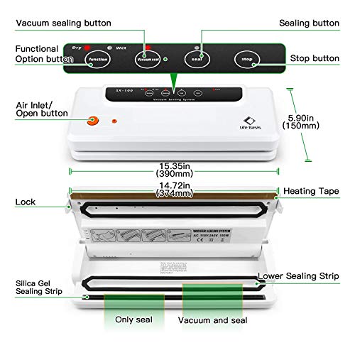 Il kit iniziale include e la larghezza massima: un tubo di vuoto per conservare frutta e biscotti freschi in barattoli o sacchetti con foro standard e sacchi professionali di sigillatura 20pcs.33 cm La larghezza massima consente di sigillare molte piccole buste in una sola volta