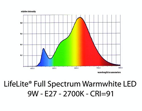 LifeLite LED 9W-E27 Full Spectrum warm light lamp, 2700K. Brilliant light quality thanks to high colour rendering CRI 91.