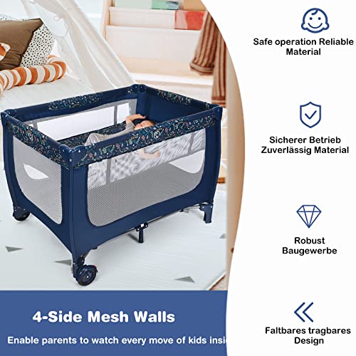 LIFEZEAL Culla da Campeggio con Materasso, Lettino da Viaggio in Tessuto Oxford con Ruote, Rete Traspirante e Borsa, Lettino da Campeggio per Bambini Fino a 3 Anni (Blu)