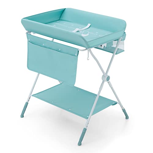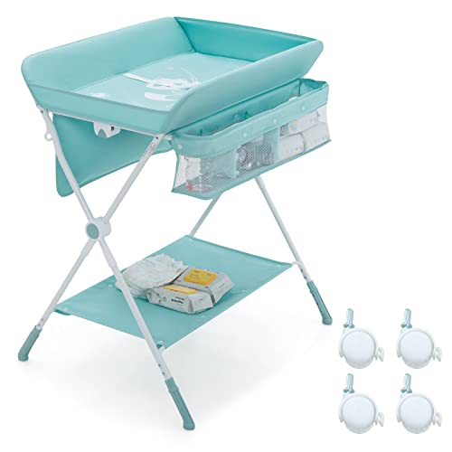 LIFEZEAL Fasciatoio Pieghevole Salvaspazio, Fasciatoio bagnetto con Borsa Portaoggetti e Ruote con Freno, Fasciatoio Neonato Regolabile in Altezza, Capacità di Carico 30 KG, (Blu)