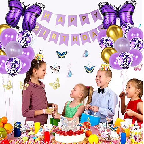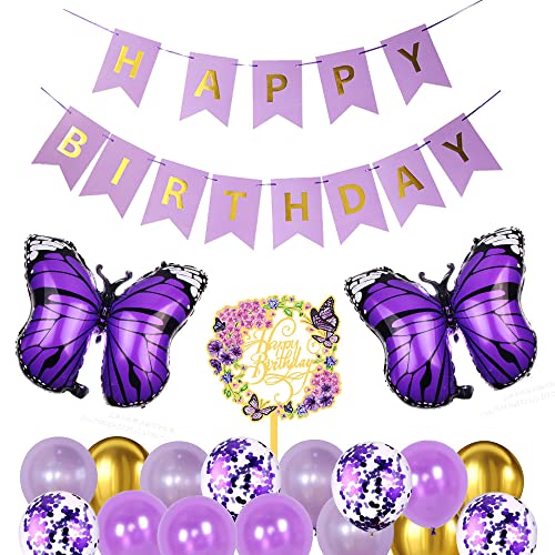 Set di decorazioni a forma di farfalla, 4 palloncini con coriandoli viola da 12 pollici. 12 palloncini da 12 pollici (4 viola scuro + 4 viola chiaro + 4 oro). 1 festone Happy Birthday, 2 palloncini in pellicola con farfalle viola, 1 decorazione per torta a forma di farfalla
