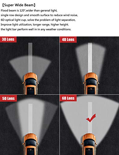 【SUPER FLOOD BEAM】 Flood beam is 120°,wider than gerenal light,single row design and smooth surface to reduce wind noise, 6D optical light cup, solve the problem of light separation, Improve light utilization, longer range, higher height.