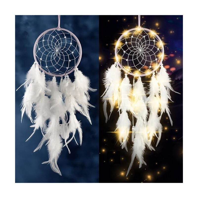 Puro artigianato manuale: utilizzo di artigianato tradizionale, artigianato squisito, maglia uniforme e meticolosa, piume morbide e impeccabili. Dimensioni: diametro: 16 cm, lunghezza totale: 60 cm. Ogni prodotto finito è accuratamente progettato per te. Design raffinato: lo stile boemo, piume e pon pon di alta qualità accuratamente selezionati, uno stile unico, è la decorazione perfetta. Illumina la notte: il prodotto è dotato di luci a LED, che possono illuminare il sensore dei sogni di notte, eliminare incubi e oscurità, creare un'atmosfera confortevole e darti un sonno migliore. Significa bene: gli acchiappasogni rappresentano buone benedizioni e portano buona fortuna, simboleggia le cose belle, può eliminare gli incubi e portarti calore e morbidezza. Ampia gamma di applicazioni: può essere utilizzato per decorare camere da letto, soggiorni e balconi, nonché matrimoni e feste. È anche il miglior regalo di benedizione per la famiglia e gli amici.