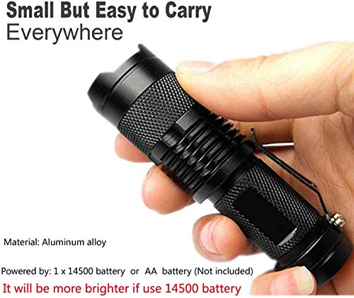 Alimentato da 1 batteria AA o 1 batteria 14500 (non inclusa). Se si alimenta la torcia con batteria 14500, sarà più luminosa dell'uso della batteria AA. Ma si prega di installare la batteria 14500 nella giusta direzione (il polo positivo della batteria deve essere rivolto verso la lampadina), altrimenti la torcia potrebbe essere danneggiata.