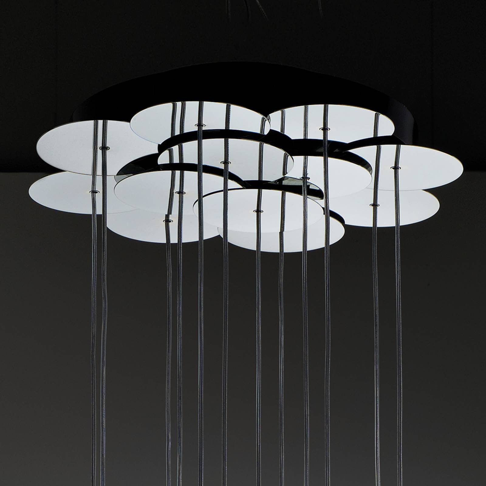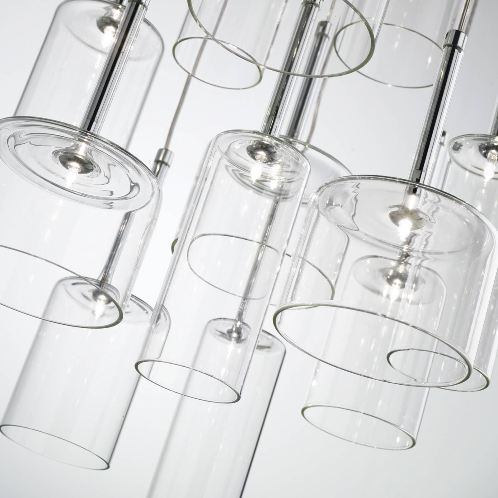 Gruppo di lampade decorative - Lampada a sospensione a 12 fiamme in vetro SpillrayQuando è spenta, la lampada a sospensione Spillray con i suoi dodici graziosi paralumi in vetro trasparente è già una vista fantastica. Appena accesa, le lampade alogene integrate iniziano a brillare e a riempire la stanza di luce intensa. In termini di design, la creazione illuminotecnica ideata da Manuel Vivian (Italia) ha molto da offrire. Ognuna delle dodici lampade individuali ha una propria sospensione con un proprio baldacchino. La semplicità delle plafoniere rotonde e cromate è tuttavia interrotta dalla loro unione. I paralumi in vetro trasparente, di varie forme e dimensioni, sono convincenti sia come solitari che nel loro insieme. Una fonte di luce che può essere abbinata a numerosi stili di arredamento moderni. Un trasformatore è incluso nella fornitura - Lampada di design di alta qualità di Axo Light