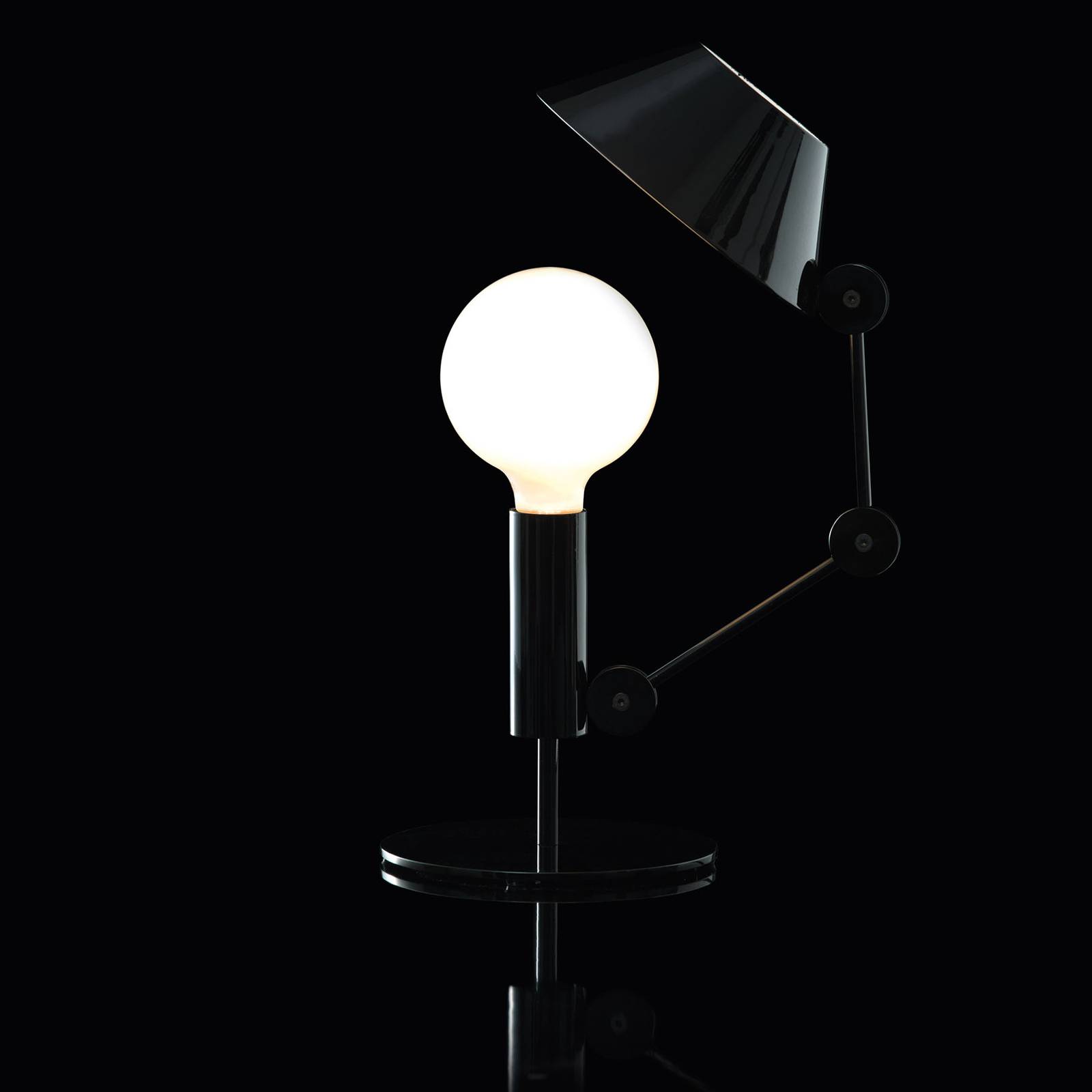 Mr. Light - questa lampada da tavolo punta il suo cappello La lampada da tavolo Mr. Light è concepita come un gioco di forme classiche di base con una creativa funzione aggiuntiva. La base è costituita da una piastra di base rotonda con un supporto sottile, una presa cilindrica e una tinta troncoconica aperta verticalmente in nero. Un braccio montato lateralmente con tre snodi sostiene il paralume in modo che quest'ultimo possa essere spostato lateralmente, rivelando la fonte di luce. Per completare l'idea creativa viene offerta una lampada in vetro E27 (Ø max. 12 cm, vedi accessori).